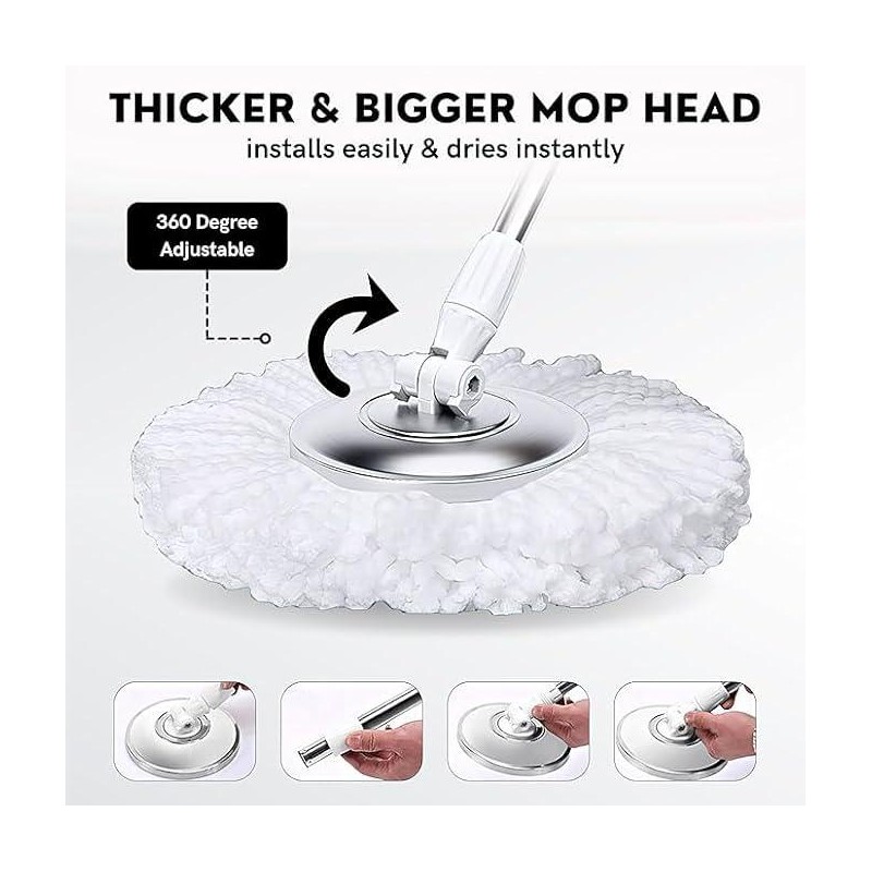 Microfiber Mop Head: The machine washable microfiber spin mop head has excellent absorption capacity, and it can easily reach any difficult corner and gap without scratch floors. Suitable for all types of surfaces, such as laminated materials, hardwood, marble, ceramic tiles, glass, etc.