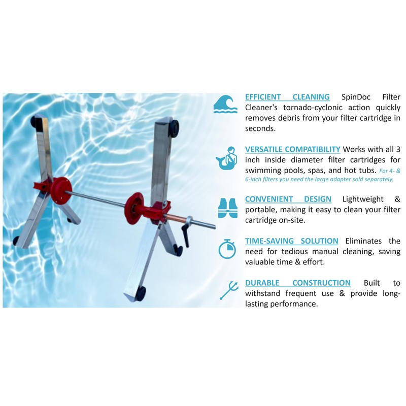 - Efficient Cleaning: SpinDoc Filter Cleaner's tornado cyclone action quickly removes debris from your swimming pool filter cartridge in seconds.