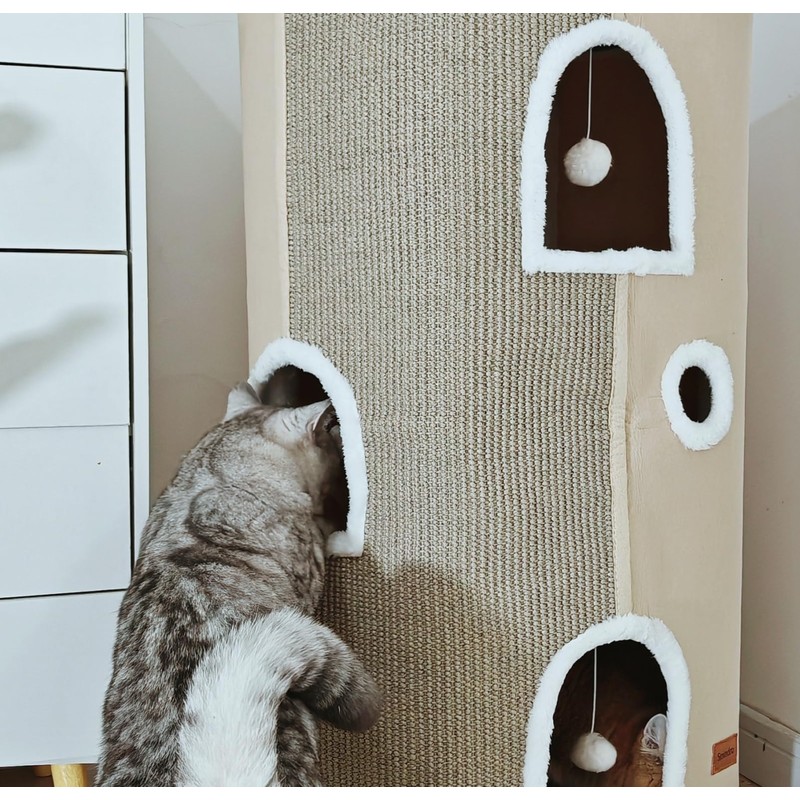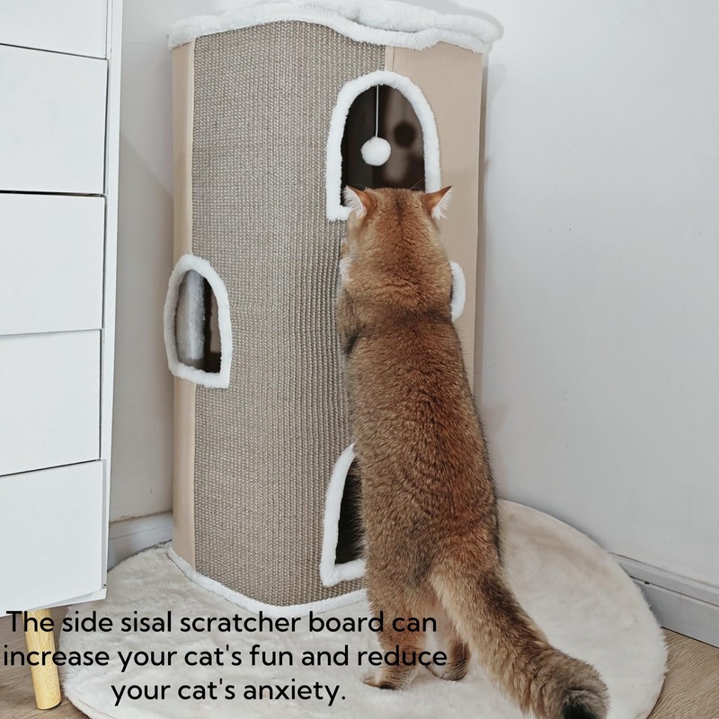 • Safe & Durable Construction: Crafted with pet-safe MDF and a plush sherpa mat, this cat bed ensures comfort and durability. The included sisal scratching board and hanging toy encourage play, keeping indoor cats entertained while protecting furniture.