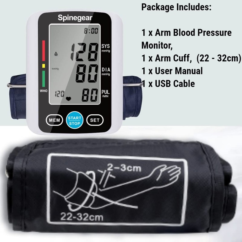 - Package Included & Customer Service: 1* Blood pressure monitor, 1* Arm Cuff, 1* USB Cable (No Battery & AC adapter), 1* Instruction Manual. Spinegear always attaches great importance to customer's product experience. If you encounter any problem or need support, please feel free to contact us, we will 100% solve your problems.