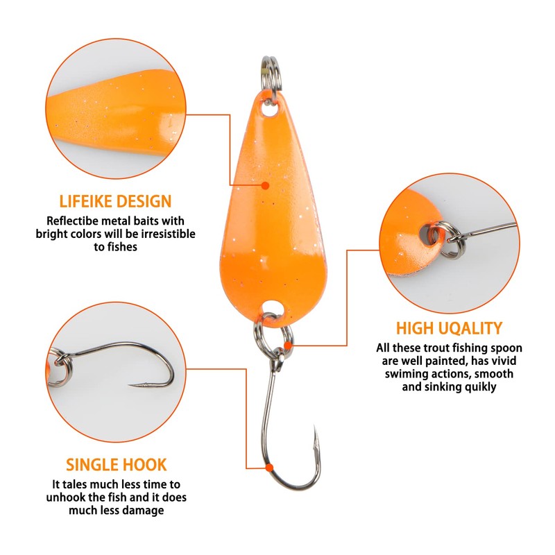 • Sharp hook: trout bait with extra strong and laser-sharpened premium hooks. The barb hook made of carbon steel is attached to the double-layered, high-quality snap ring of the trout spinner. It takes much less time to loosen the fish and it will take much less damage. Therefore, it is also ideal for most lakes and ponds.