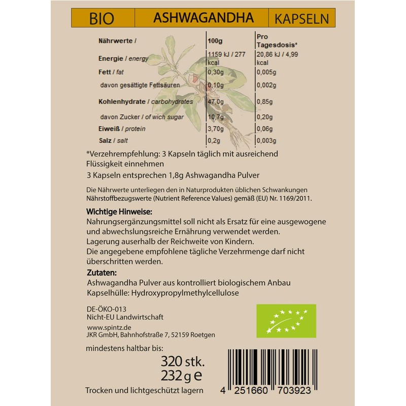 SPINTZ Pack of 320 Organic Ashwagandha Capsules Withanolide Content of ≈ 3.5% - High Dose Ashwaganda Tablets - 600 mg Ashwagandha Powder per Capsule - Indian Ginseng, Sheepberry | Plastic-Free