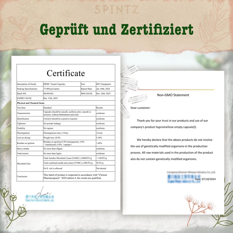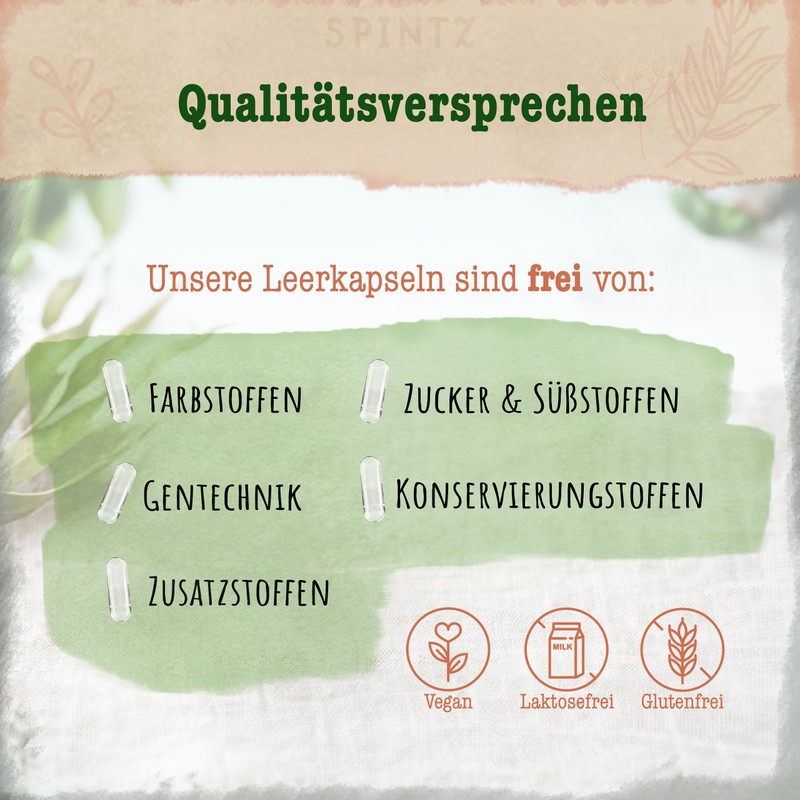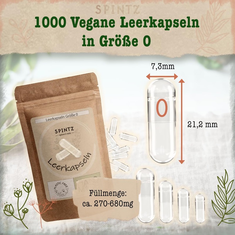 - Versatile and durable – SPINTZ vegan empty capsules 0 are independently tested in Germany for maximum safety and quality. Completely free from animal ingredients, non-GMO and allergen-free. Ideal for you if you have high standards of quality and do not want to compromise.
