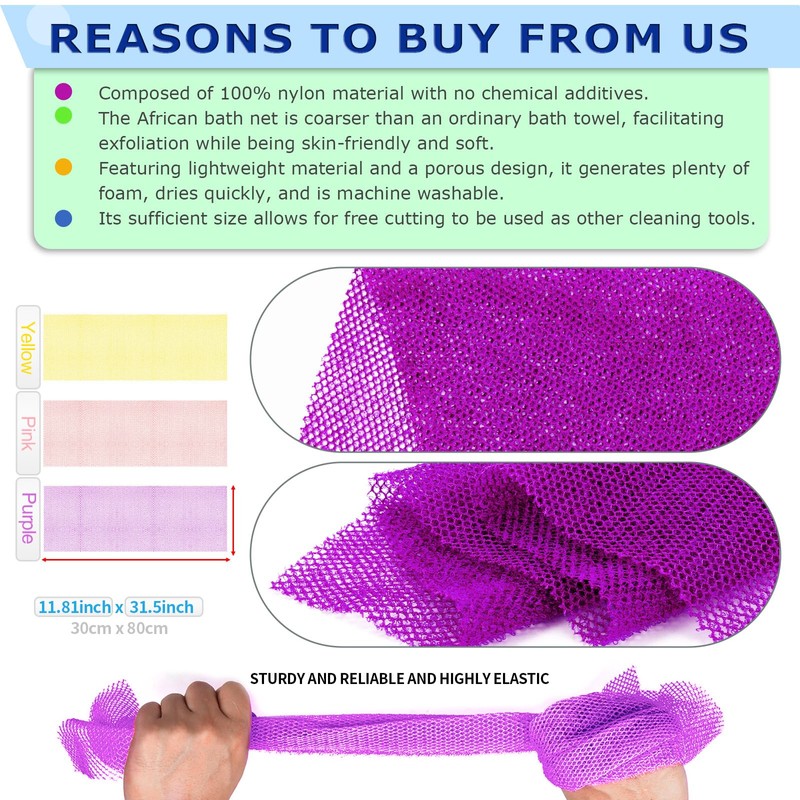 - 【EXCELLENT REBOUND AND STRETCH】Measuring approximately 11.8 inches (30 cm) in width and 31.4 inches (80 cm) in length, the African Net Sponge boasts outstanding rebound and stretch capabilities, allowing you to reach all areas of your body, including those hard-to-reach spots like your back, hands, and feet.