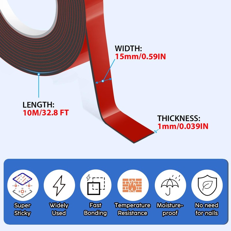 - 【Dimensions】Heavy-duty double-sided foam tape, 0.59 in wide * 32.8 ft long, 0.04 in thick, comes with 3 alcohol pads for almost immediate bonding with no drying time required. This product is available in a 1-pack and a 2-pack, allowing you to purchase the quantity that meets your needs. It is highly suitable for heavy-duty bonding applications such as adhering glass and doors, making road signs, and more.