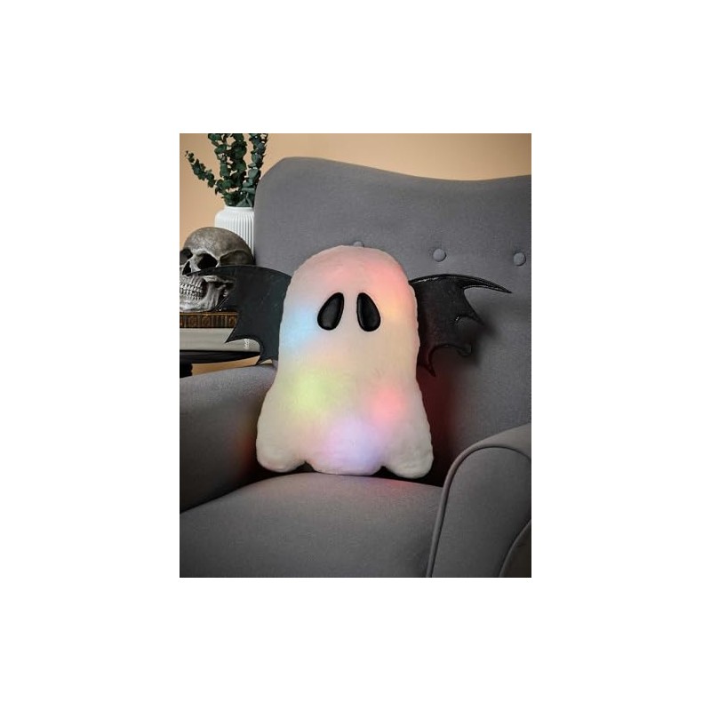 Brighten up your haunted home with a ghost that glows! This Light-Up Ghost bat Plush is a great spooky-cute addition to your Halloween decor lineup. With sof, cuddly fabric, color-changing LED lights, and faux leather bat wings, it's the ghost you'll want to snuggle... even if it's ready to haunt.