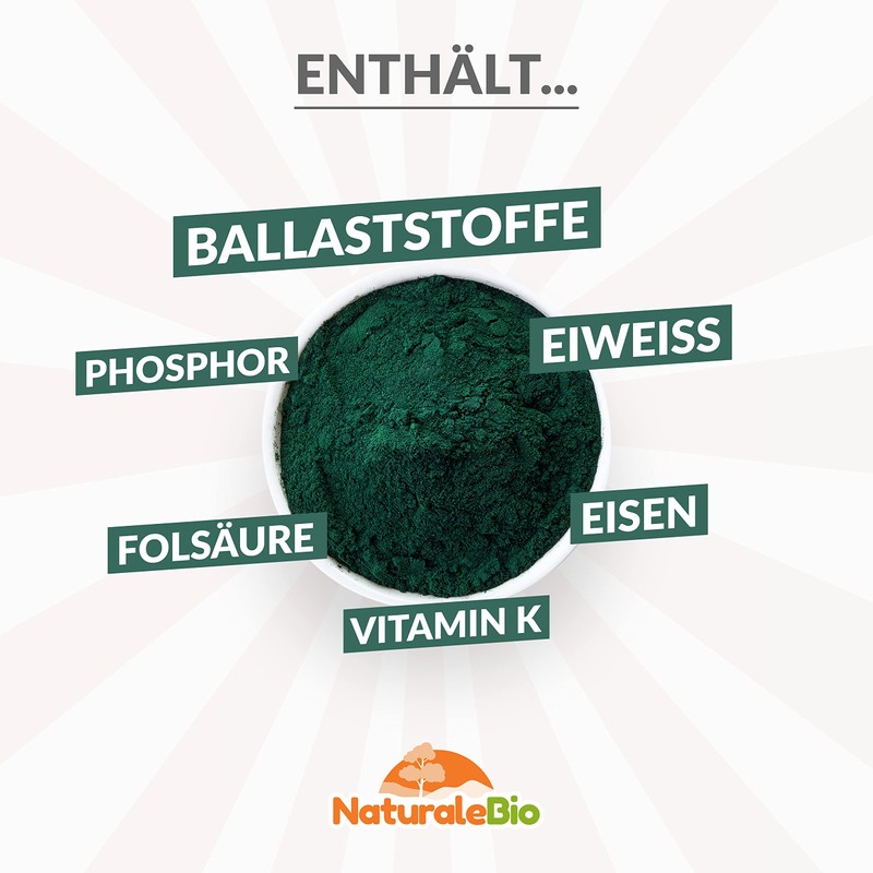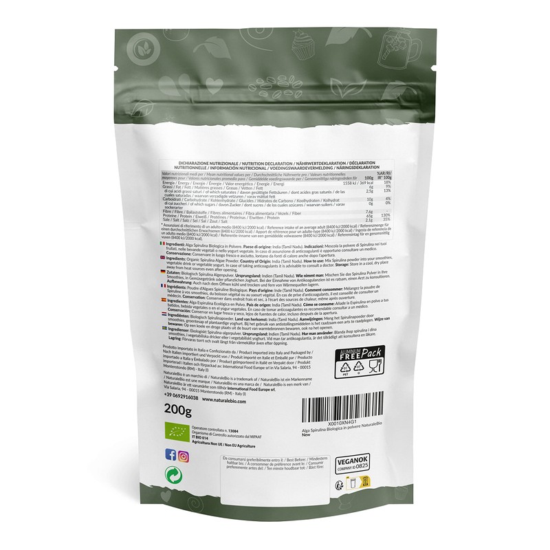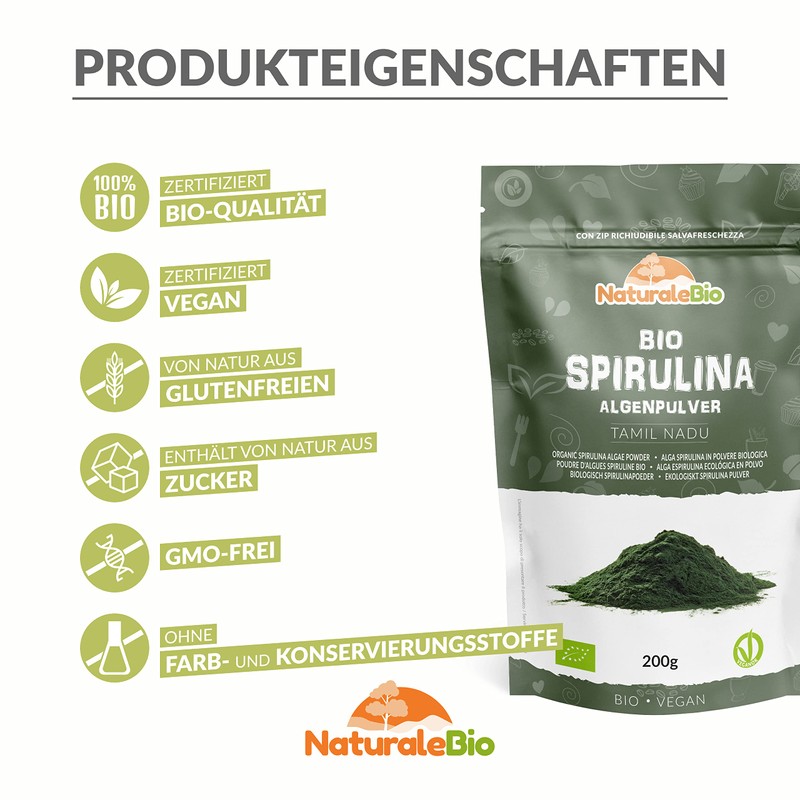- Organic quality certified and vegan: 100% pure, raw and organic. Organic Spirulina from NaturaleBio is free from pesticides and unnatural chemical fertilisers that are not beneficial to body and health. No additives and preservatives. Suitable for vegan and vegetarian diets. Produced in India in Tamil Nadu and certified as an organic product by the control bodies of the Ministry of Agriculture.
