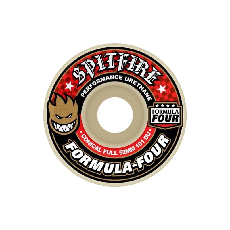- One (1) set of 58mm Spitfire Wheels Formula Four Conical Full White / Red Skateboard Wheels - 101a; includes four (4) wheels