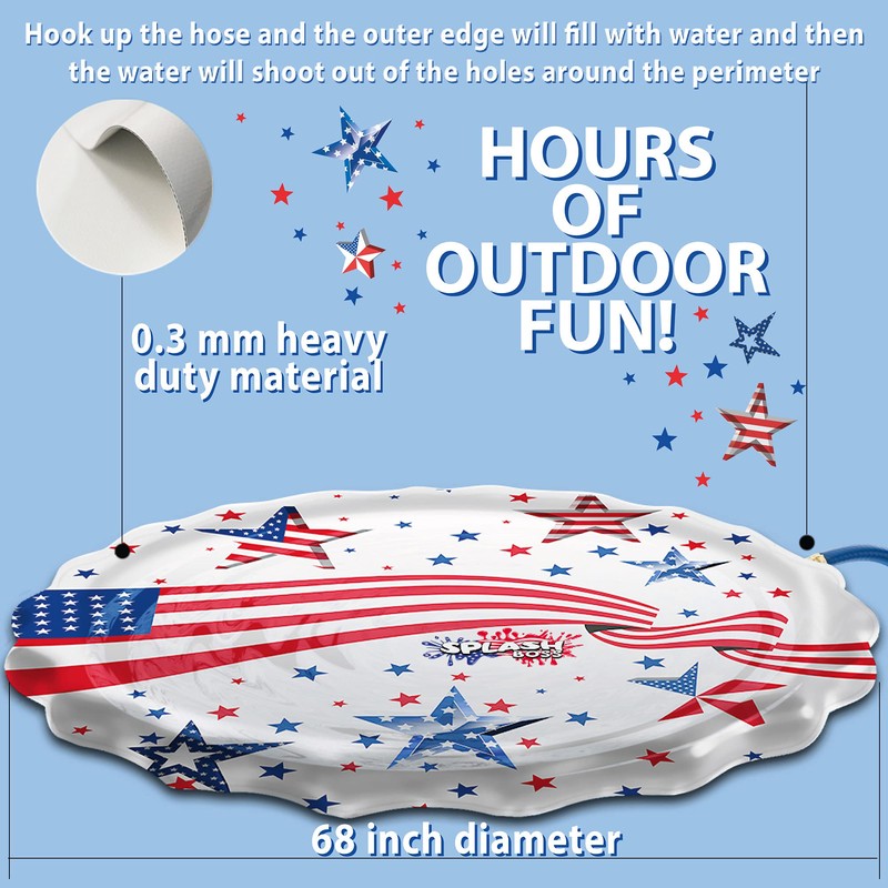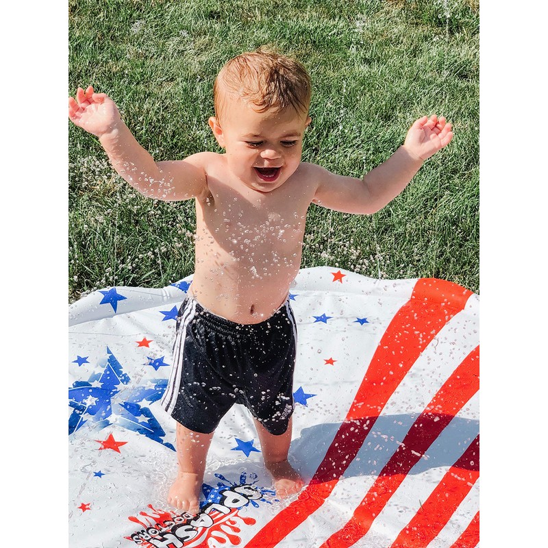 - Proud American Company! We appreciate you supporting our small family-run company in the Midwest. We have a 100% satisfaction guarantee and completely stand behind our high quality, super durable children's splash mat. Even more fun for infants, boys and girls than the standard small inflatable pool, unicorn/rainbow sprinkler, inflatable waterslide, bounce house, sandbox or water table!