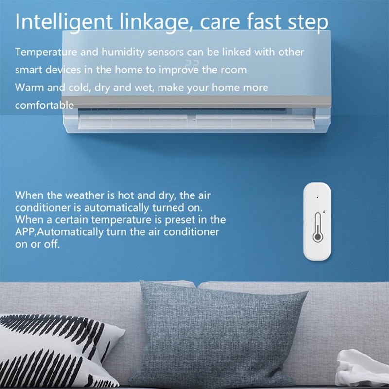 - 【Intelligent Linking】: The sensor can be connected to other smart devices in your home to improve indoor temperature and humidity and make your home more comfortable. In hot weather, the air conditioner turns on automatically. You can preset in the app that the air conditioner is switched on or off when a certain temperature is reached. It can automatically turn the air conditioner on or off based on the temperature