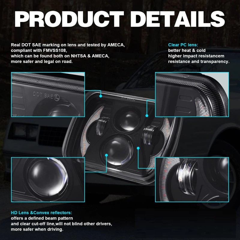 splledlights 1982-1995 fit Toyota Pickup H6054 Upgrade Black 2PC 7x6" Rectangle LED Headlight