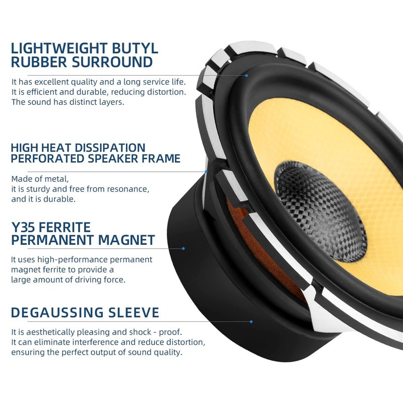 - 【PURE CARBON FIBER CONSTRUCTION】Featuring a yellow carbon fiber cone with acoustic-specific adhesive coating, the provides lightning-fast transient response and zero distortion. The all-carbon design preserves material integrity for studio-quality sound reproduction that outperforms composite cone speakers.