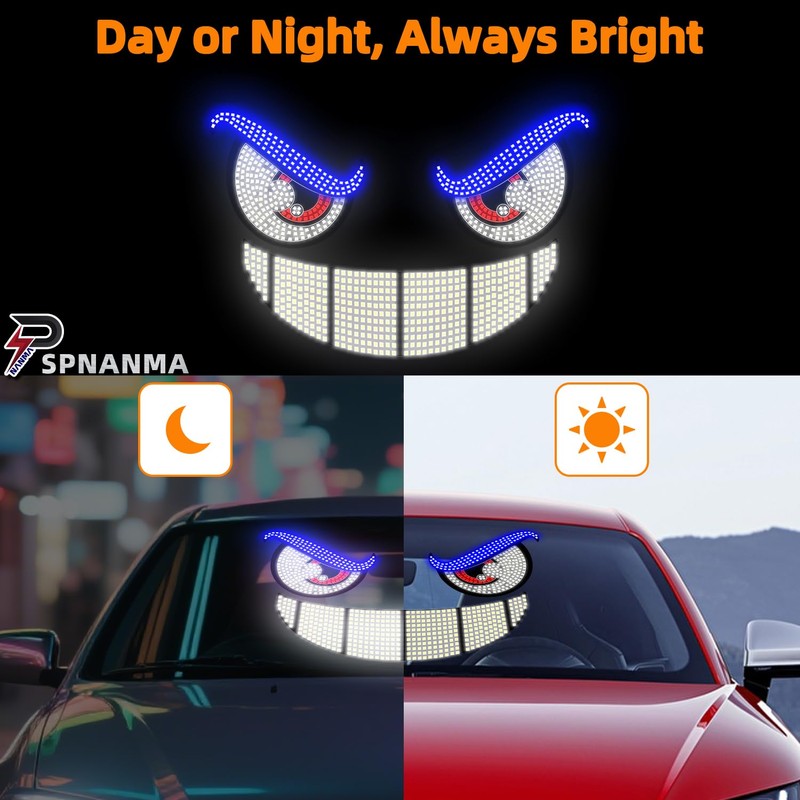 - 【Unique Devil Eyes and Smile Design】Stand out with SPNANMA's devil eyes and grin LED display. The combination of two animated car eyes (6.2in x 3.7in) and a 11in x 3.14in LED smile panel gives your vehicle a bold, expressive personality.