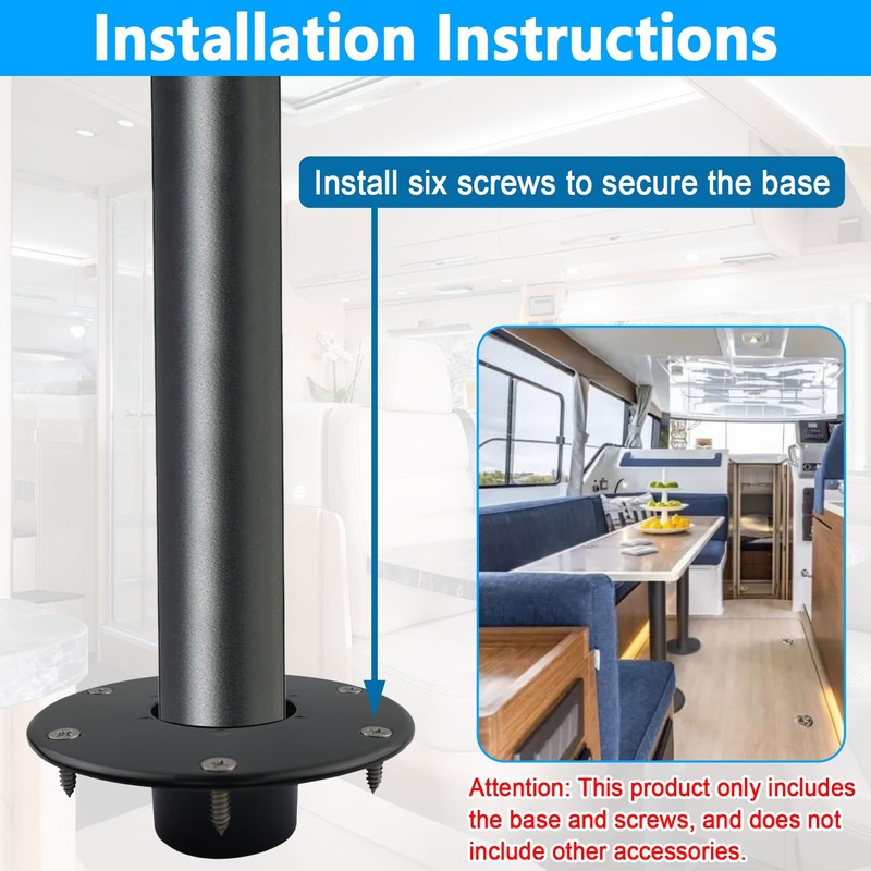 Universal RV Table Base Mount Heavy-Duty Chrome-Plated Aluminum Corrosion-resistant & scratch-resistant for long-lasting use Easy Screw-On Installation Fits 013-1112 and similar table legs securely Reinforced Flush Mount Design Ideal for RVs, trailers, and campers