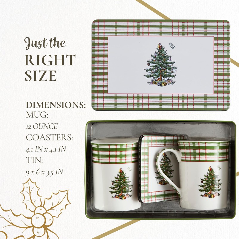 Spode Christmas Tree 5-Piece Mug & Tin Set - Fine China Mugs & Cork Coasters, Holiday Gift Set with Plaid Tartan Accents - For Breakfast Tables, Holiday Entertaining, Festive Kitchen Displays