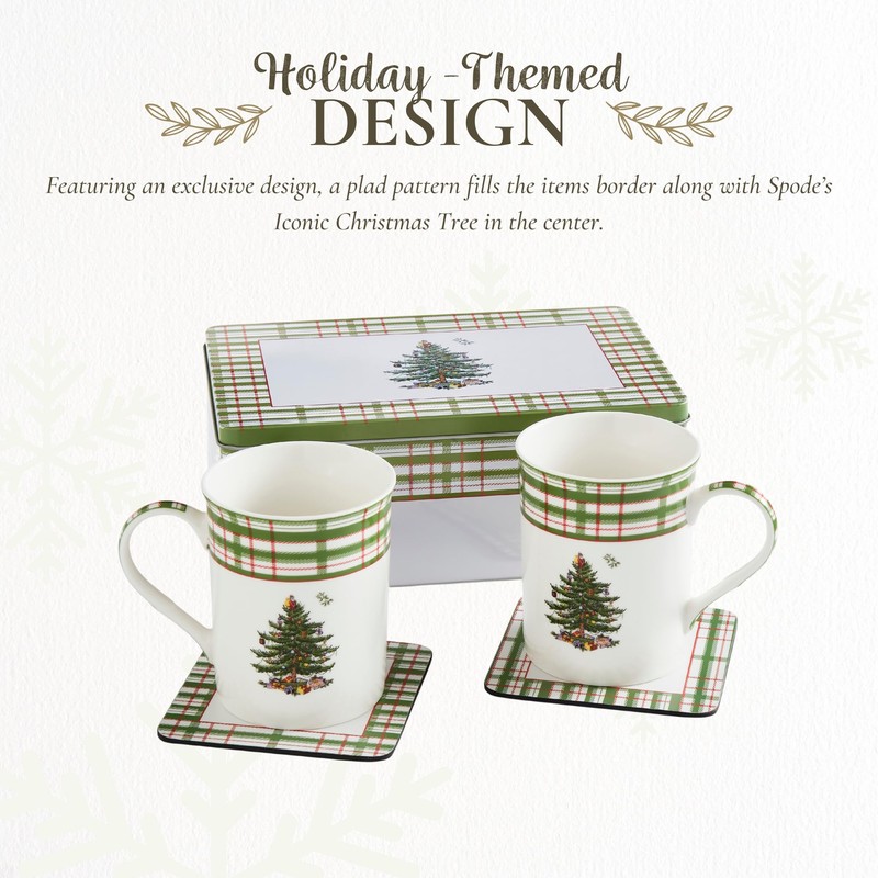 - Holiday Gift in a Tin: Includes two fine china mugs and two cork-backed coasters, packaged in a 6 x 6 x 3.5 inch plaid tartan tin—a festive and functional presentation for gifting.