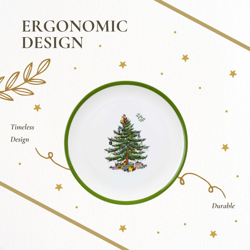 Spode Christmas Tree has graced tables all over the world since 1938. The pattern feature's a green banded traditional Christmas tree design. Each year this beautifully classic pattern adds an extensive array of new item's to its range. There is no better holiday tradition than the gift of Spode Christmas Tree. The new line of Melamine items are perfect the times when, fragile just wont due. Perfect for children, indoor entertaining or for a Christmas Picnic. The 3 piece Children's Set comes with Dinner Plate, Individual Bowl and Two Handled Mug.