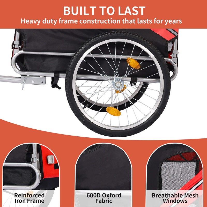 - Material: Built with powder-coated steel frame and waterproof oxford fabric, this dog bike trailer is durable and stable for long lasting use. With a weight limit of up to 88 lbs.