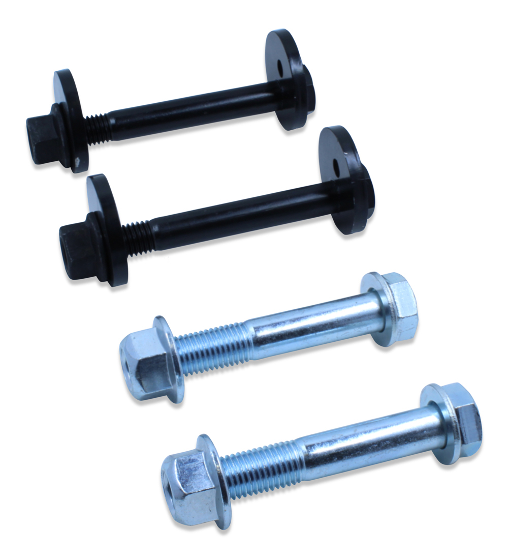 This front lower control arm cam bolts package includes two (2) new super strength Grade 12.9 front cam bolts, two (2) new eccentric cam washers, and two (2) new flanged "Top Lock" nuts (see the picture).