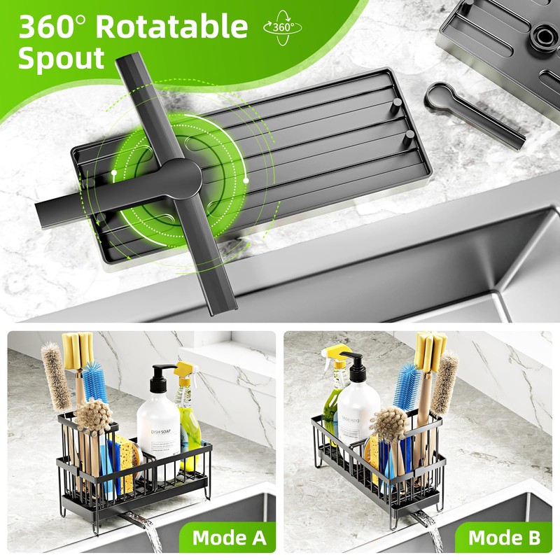 - 【Self-Drainage System】This kitchen sink organizer comes with a water tray which including a 360° rotatable spout. The water drop on the tray and drain into the sink automatic. Thanks to this swivel spout, you are allow to place the sponge holder by any side around the sink