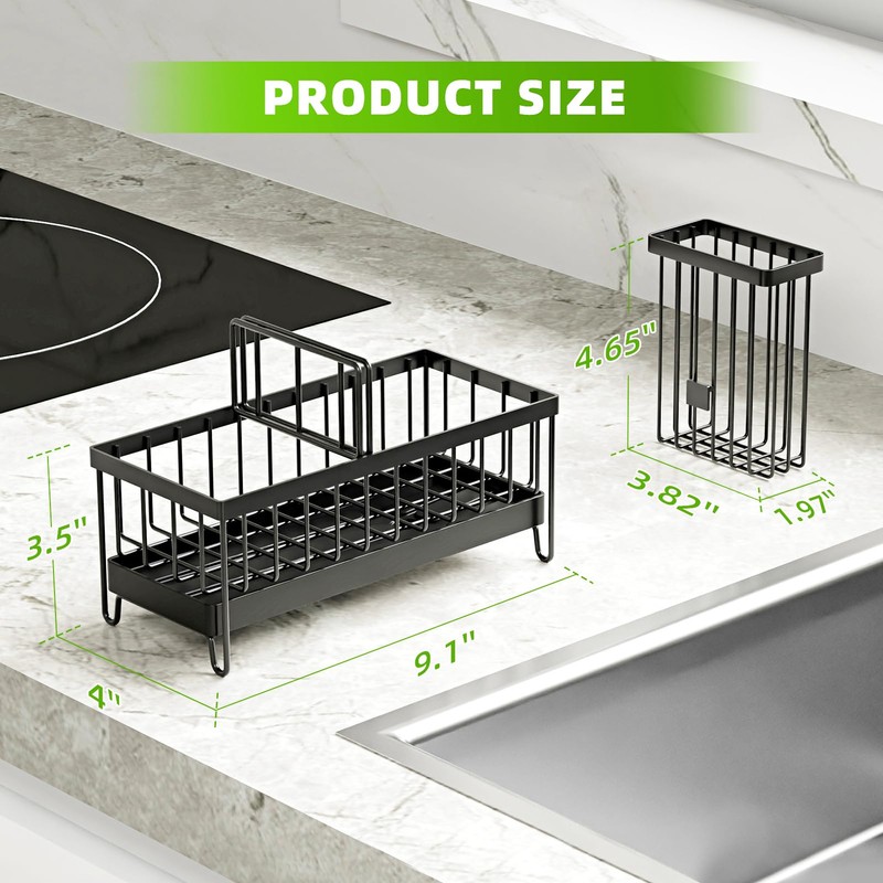 - 【Pratical Capacity】Features with compact dimension of 9.1”L x 4.1”D x 6.3”H, our sponge holder for kitchen sink can help to organize most of your kitchen tool accessories easily, such as detergent, sponges, short or long brushes, dish soap dispensers, sink stopper, stainless steel scrubber and so on