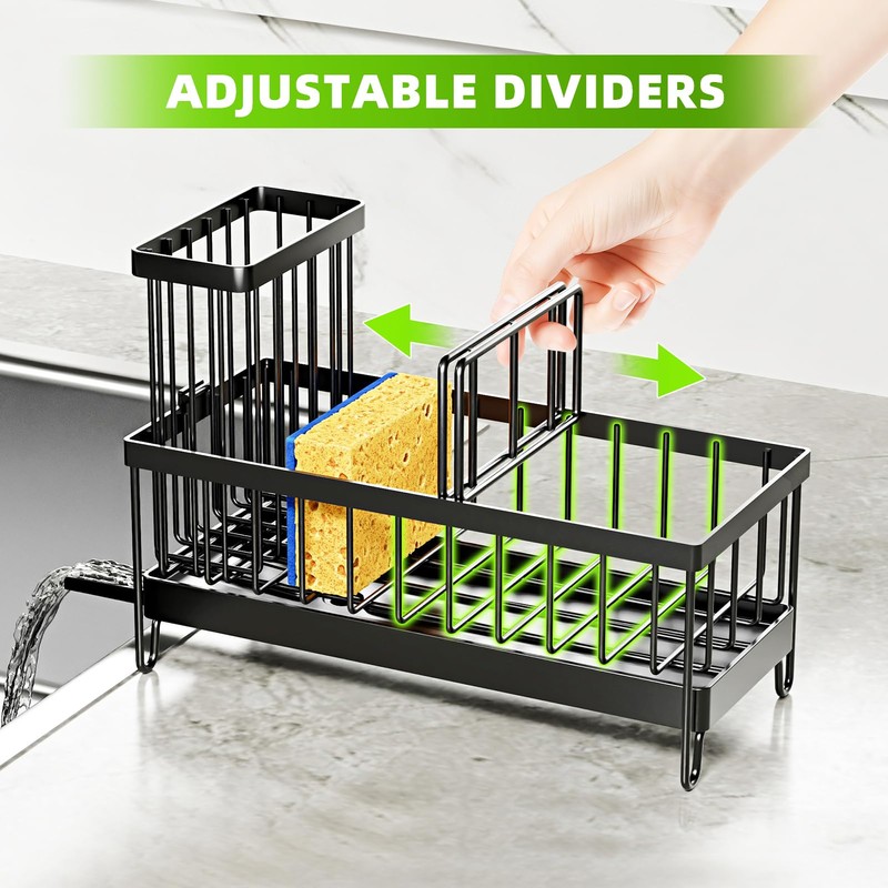 - 【Reasonable Divider】The kitchen sponge holder for sink divider design allow it to have 3 seperated spaces to organize kitchen items, the adjustable design allow you to place varies size items easily