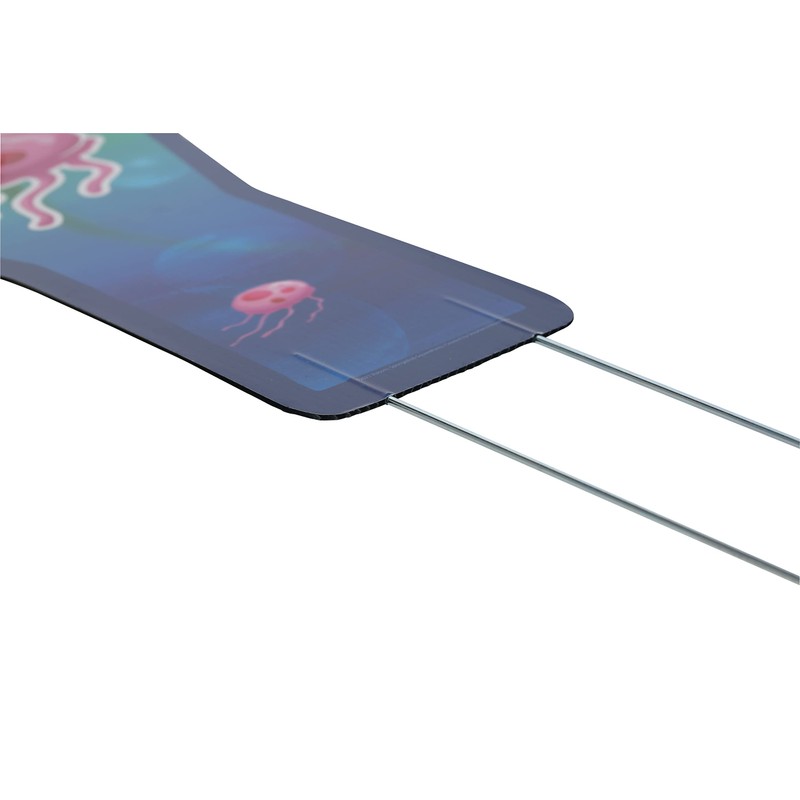 - All pieces are made of plastic corrugate with printed overlay. Metal stakes are included for outdoor use in dry conditions.