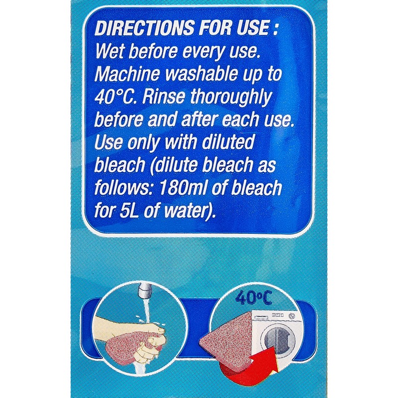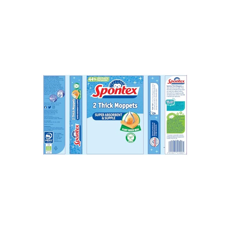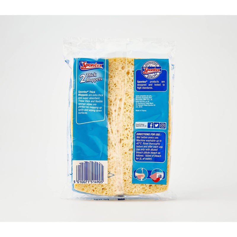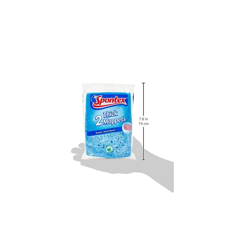 Made using natural biodegradable cellulose sponge, Spontex Thick Moppets are extra thick and super absorbent. These thick and flexible sponge wipes are perfect for mopping up spills and wiping down surfaces.Sponge size: 16 x 12 cm. Composition: Biodegradable sponge.Assorted colours, mixed pack.For best results, wet before every use. Rinse thoroughly before and after each use. Machine washable up to 40C. Use only with diluted bleach (dilute bleach as follows: 180 ml of bleach for 5 Litre of water).Note: Date mentioned on the item is Manufactured date and not the Expiry date.To avoid suffocation please keep this wrapper away from babies and small children.