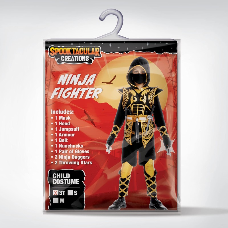 - IDEAL BLACK NINJA COSTUME: Our Ninja Costume for Boys includes a Mask, Hood, a Jumpsuit, an Armour, a Belt, a Pair of gloves, 2 ninja daggers, and other foam accessories. Available in sizes Size: Toddler ( 3 – 4 ), Small ( 5 – 7 ) , Medium ( 8 - 10 ) , Large( 10 - 12 ) , X-Large( 12 - 14 ).
