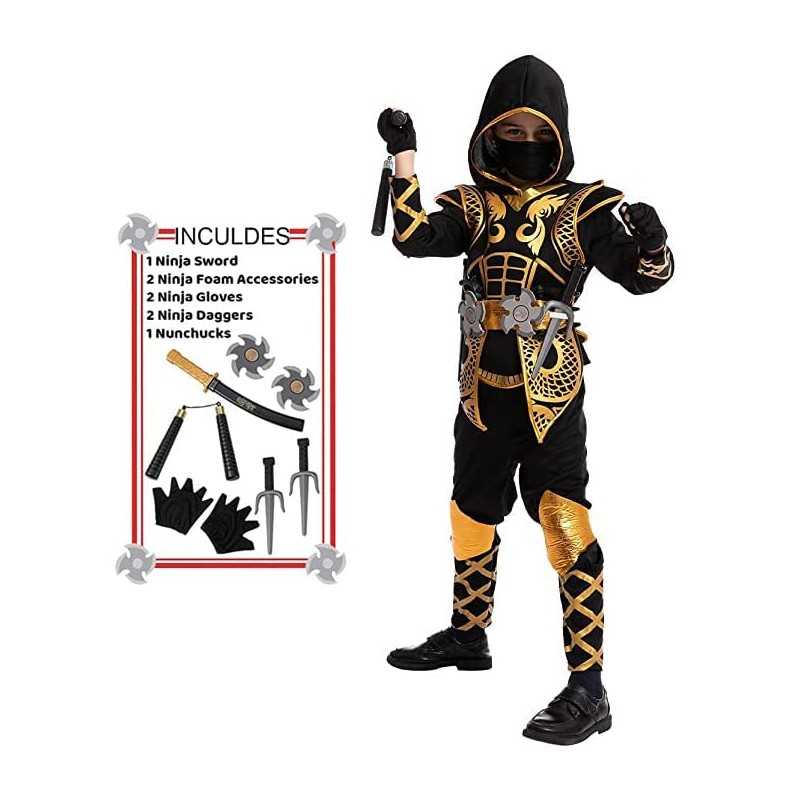 - ALL-IN-ONE COSTUME SET. This costume will definitely make your little one stand out from the crowd. They will surely have fun throwing stars and daggers and feel like a real ninja.
