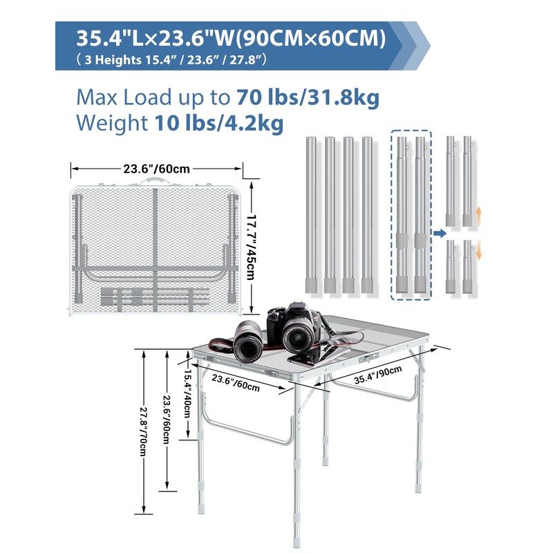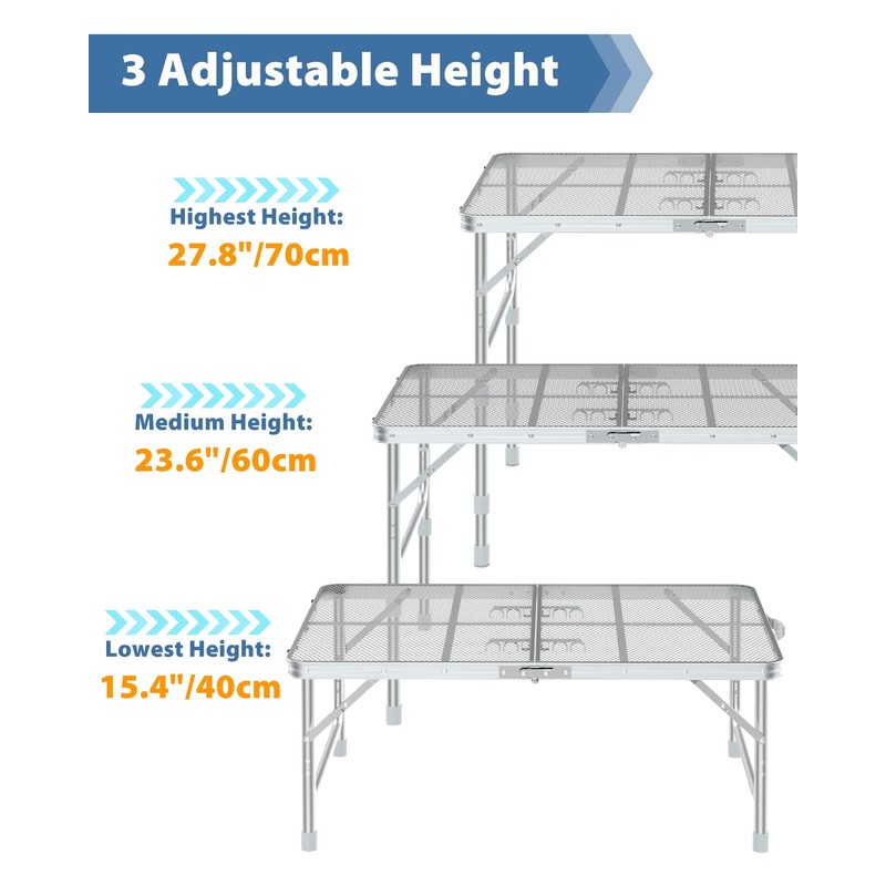 - 3 ADJUSTABLE HEIGHTS: Triple heights, triple convenience. This folding table comes with 3 adjustable heights-15.4'', 23.6'' and 27.8''. No need to worry about uneven floors or bumpy ground. Just simply adjust the table legs to suit your needs, and you're ready to go.