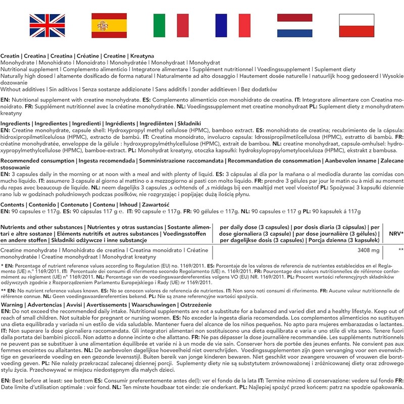 - HOCHDOSIERT - Unser Kreatin Monohydrate ist hochdosiert mit 3400mg Kreatinpulver pro Tagesdosis (3 Kapseln). Die Tabletten entsprechen einem sehr hohen Reinheitsgrad
