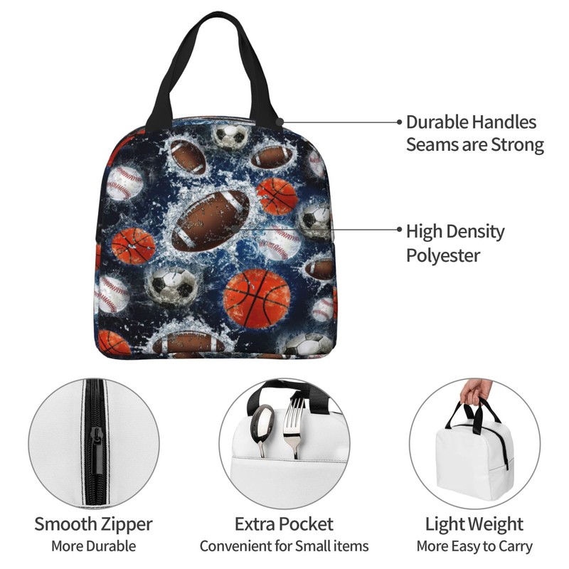 Sports Balls Lunch Box Basketball Baseball Football Soccer Insulated Lunch Bag for Kids Women Men Reusable Cooler Tote Bag with Front Pocket for Girls Boys Students School Picnic Travel Office