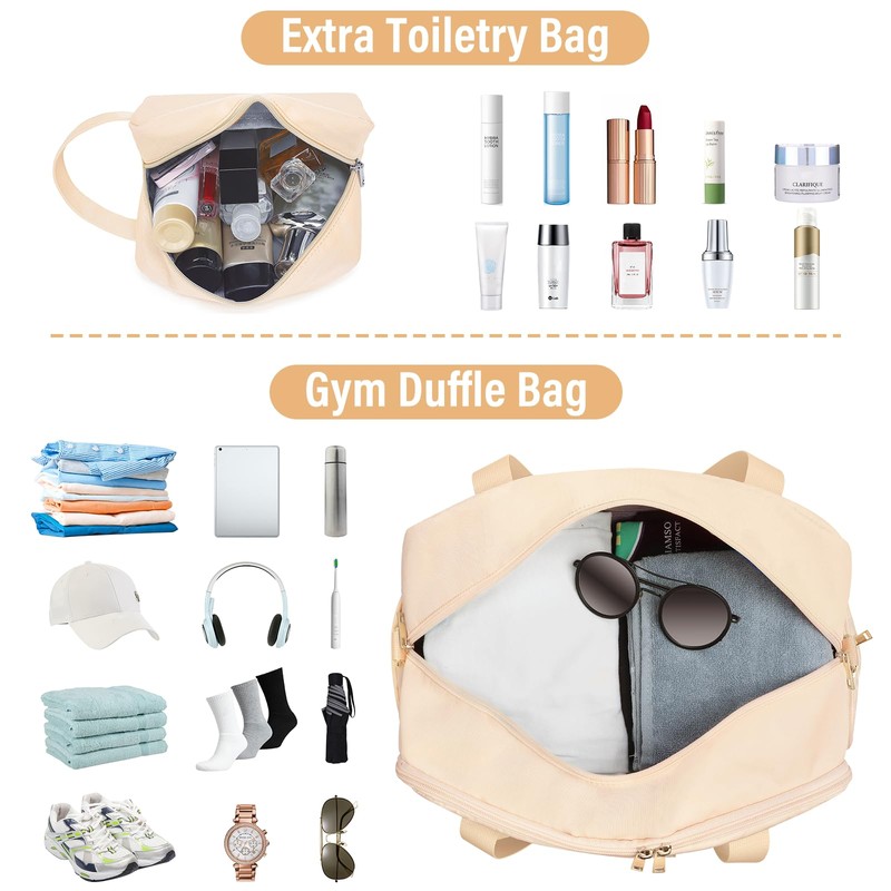 • 【Multipurpose Sports Bag】- This sports bag for women has a spacious main pocket and 10 separate pockets, which can hold fitness equipment, workout gear, clothes, shoes, a water bottle, towels and other items, helping you easily organize all your essential items for sports or travel. Additionally, it comes with an additional toiletry bag which size: 7.5"L×5.0"W x 4.0"H, can hold your skin care products, toiletries, cosmetic and other items. Help you organize and maximize your space when travel.