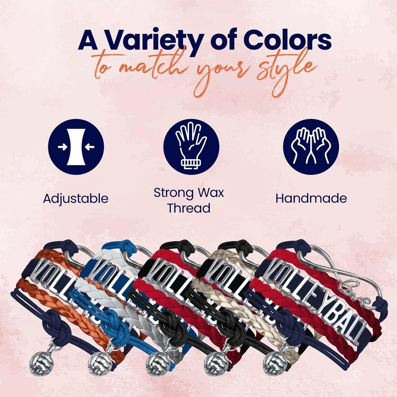 - Friendship Bracelet with Volleyball Motifs- Friendship bracelets weave in colorful threads with moveable volleyball letters. Featuring an infinity symbol & silvery charm in the shape of a Volleyball.