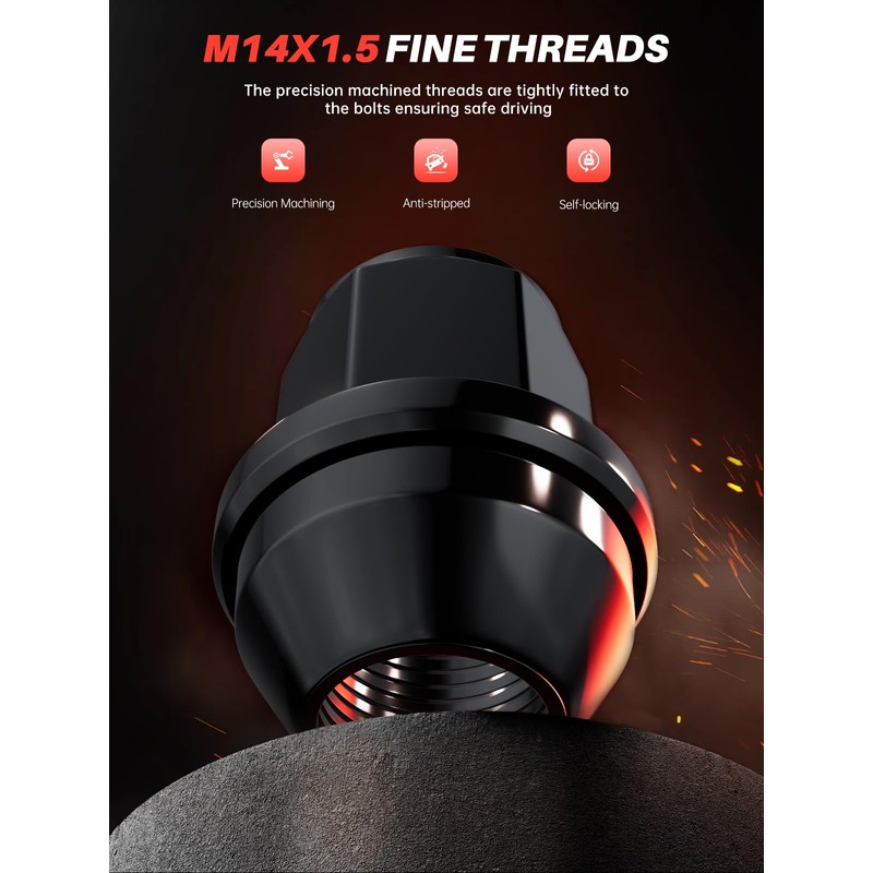 - [SPECIFICATION]: 20Pcs lug nuts set with M14x1.5 thread pitch - 1.41inch(36mm) height - 13/16inch(21mm) hex - 1.18inch(30mm) width - closed end - 60 degree conical seat - black one-piece lug nuts