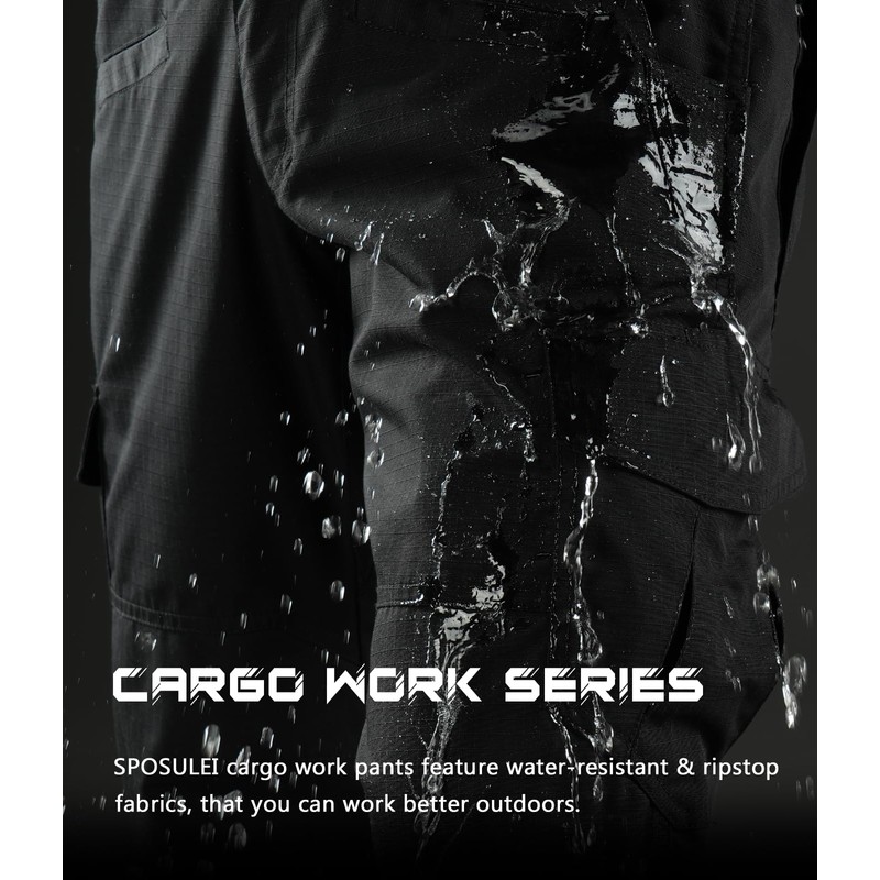 SPOSULEI Cargo Work Pants for Men Ripstop Tactical Pants Lightweight Water Resistant EDC Hiking Carpenter Hunting Pants with Multi Pockets Black 38Wx32L