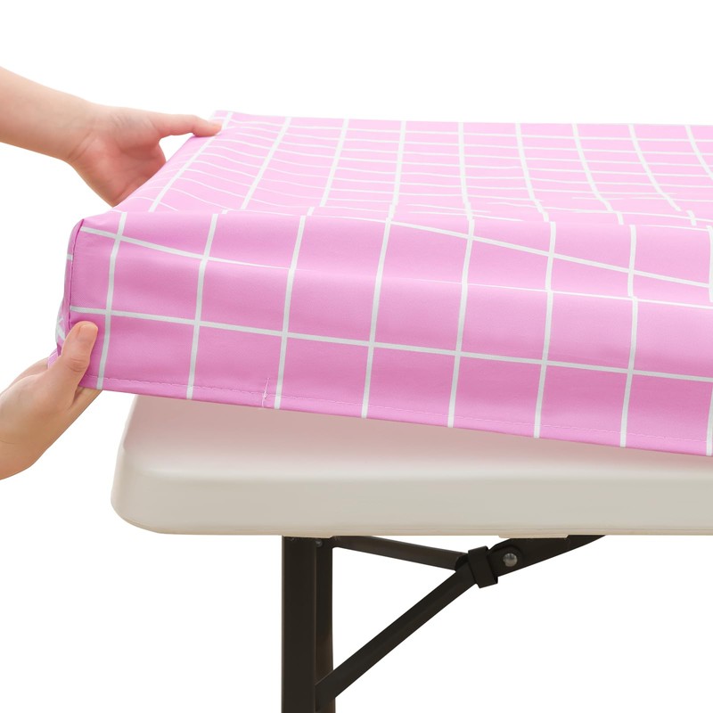 - [Elastic Fit & Non-Slip] The table cloth with elastic edge design allows the cover to fit ideally on the rectangle folding table. The fitted tablecloth will not move, whether it is accidentally pulled or a gust of wind blows in to interfere with your pleasant dinner.