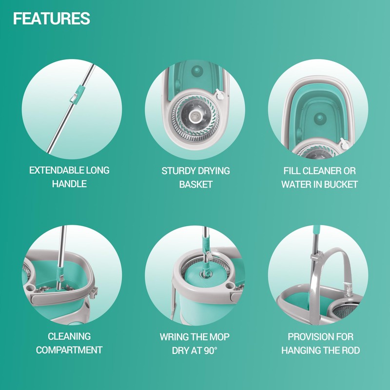 - ♻ Our Mop works hard for you: Our rounded mop head means you will be able to get those hard-to-reach places like under the sofa, or those tough corners. It is designed to ensure the mops surface maintains full contact with any type of floor like tile, or laminated floors. You can even use the Spotzero on window glass. The microfiber ensures that there will be no residue left behind. The spinner in the bucket means, no more hand wringing your mop. No more dirty and wet hands.