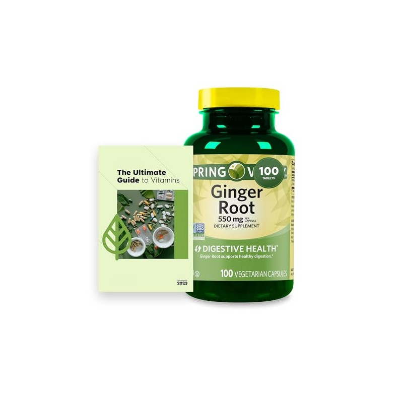 SPR-ing Valle Ginger Root Digestive Health Dietary Supplement Capsules, 550 mg, 100 Count Bundle with Vtmx Vitamin Guide