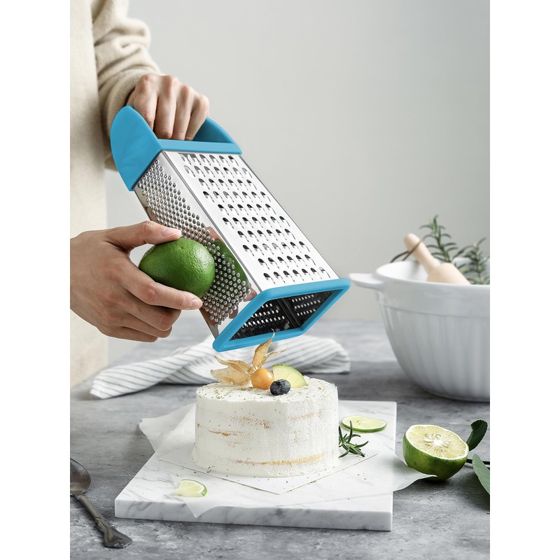 - Incredible Versatility With The 4 Sided Design Kitchen Grater: Coarse grating, Medium grating, Fine grating/Zester and even a Slicer - all in one convenient tool. Quickly prep an array of foods like cheese, parmesan, potato, squash, zucchini, carrots, lemons and cucumbers. Multi-functional manual cheese grater with a comfortable handle that gives you total control.