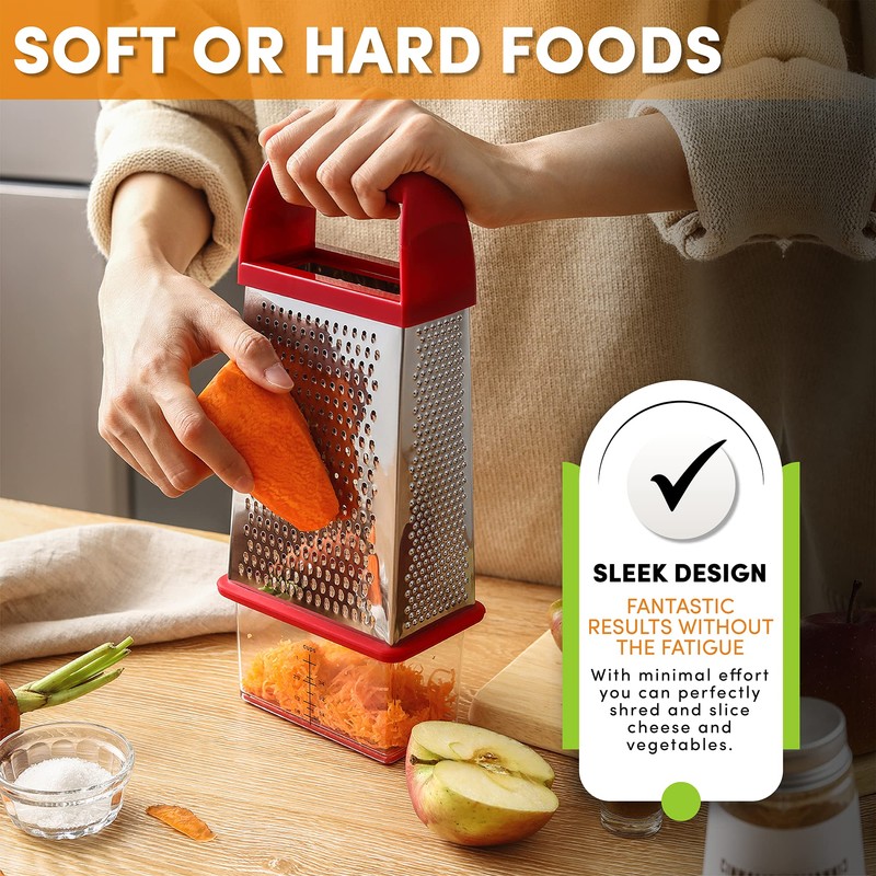 - Incredible Versatility With The 4 Sided Design Kitchen Grater: Coarse grating, Medium grating, Fine grating/Zester and even a Slicer - all in one convenient tool. Quickly prep an array of foods like cheese, parmesan, potato, squash, zucchini, carrots, lemons and cucumbers. Multi-functional with a comfortable handle that gives you total control.