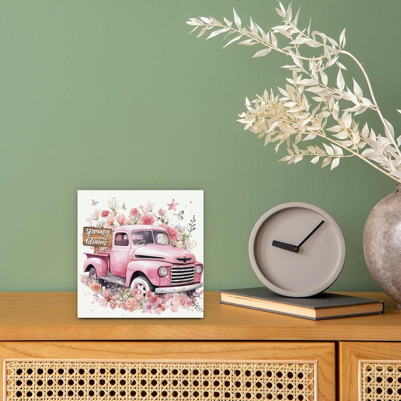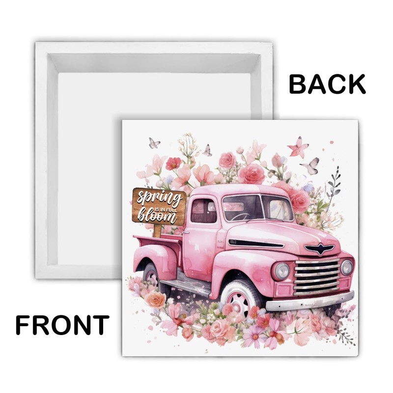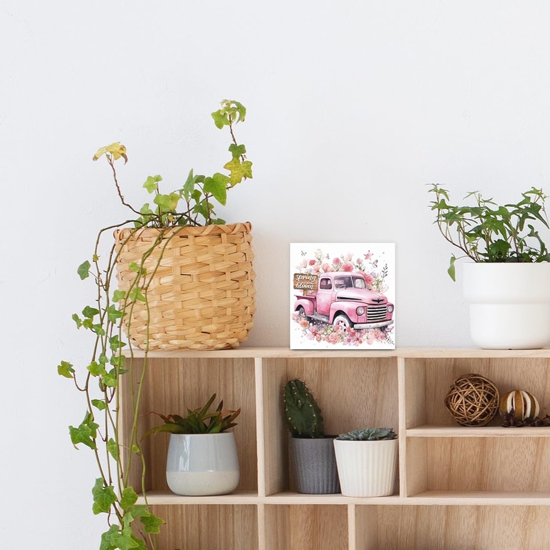 Spring Decor Spring Pink Truck Wood Block Sign Spring in Bloom Wooden Box Sign Home Table Desk Shelf Tiered Tray Decoration