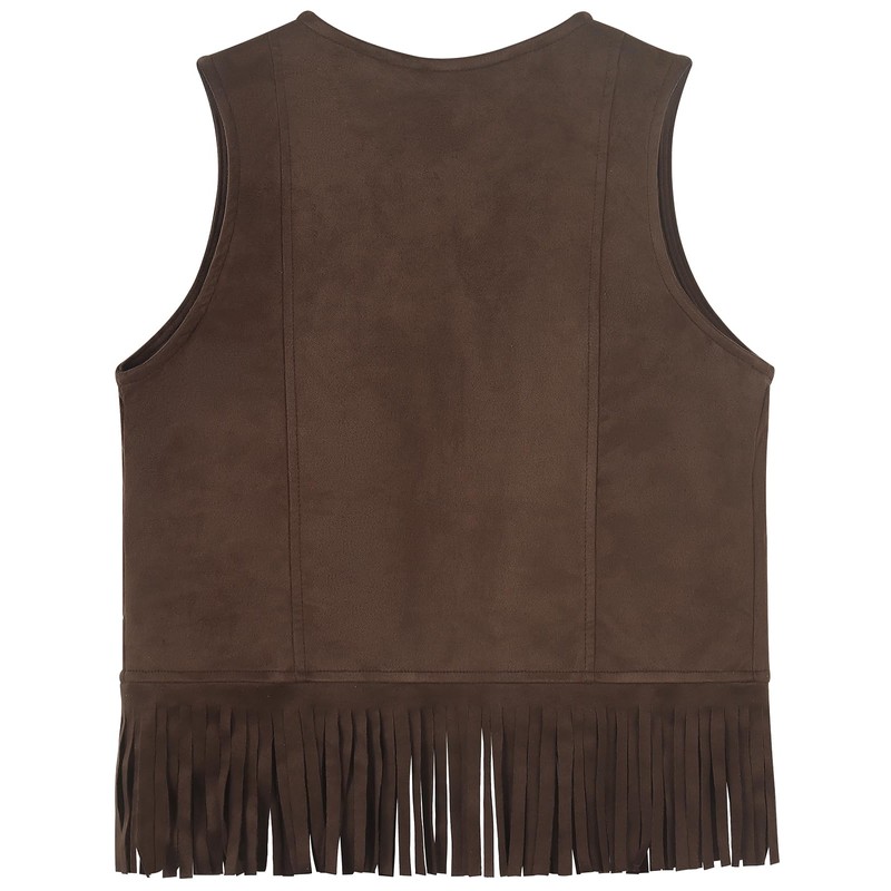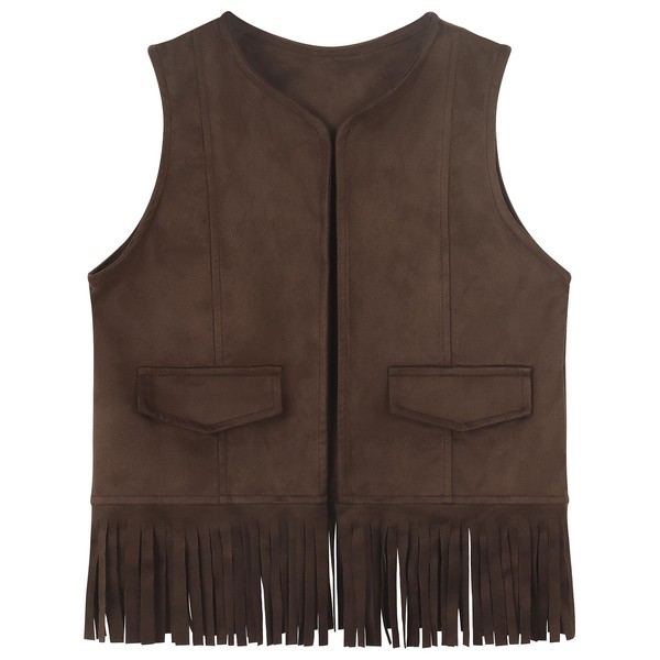 Spring&Gege Kids Suede Fringe Vest 70s Cowboy Cowgirl Western Faux Tassels Jacket Cardigan, Coffee, Size 7-8 Years