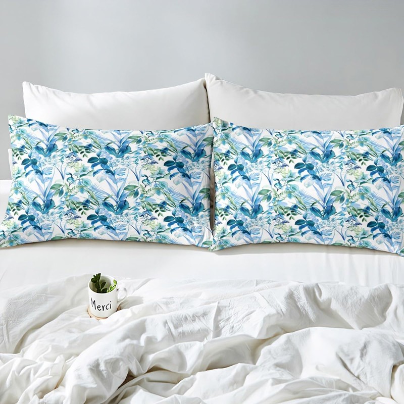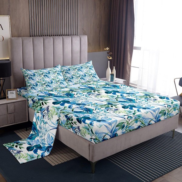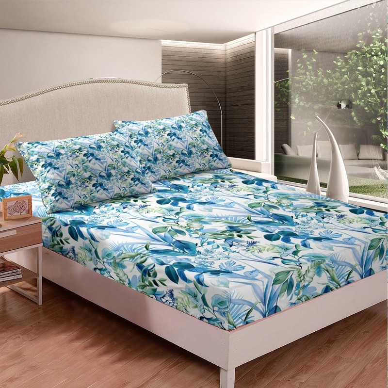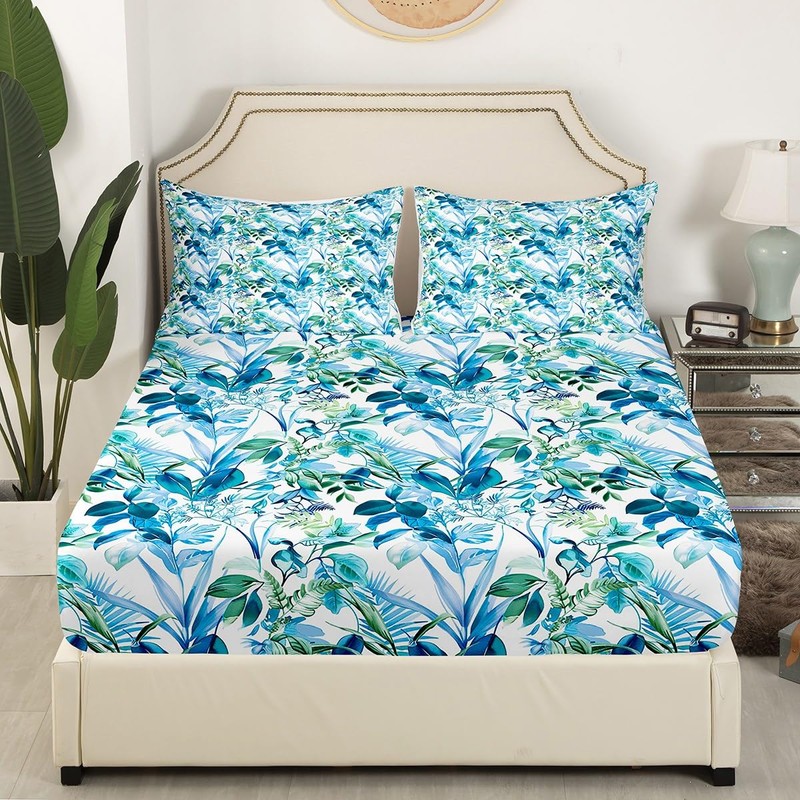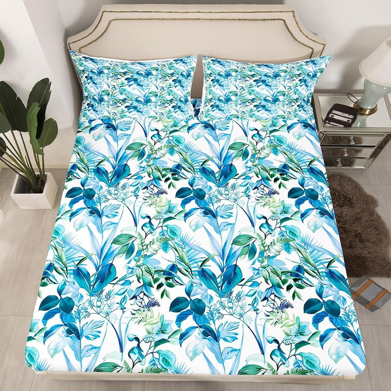 Spring Green Leaves Bed Sheet Set Twin,Tropical Palm Leaves Botanical Leaves Soft Microfiber Sheet Set,Rustic Farmhouse Style Fitted Sheet + Flat Sheet + 1 Pillow Case