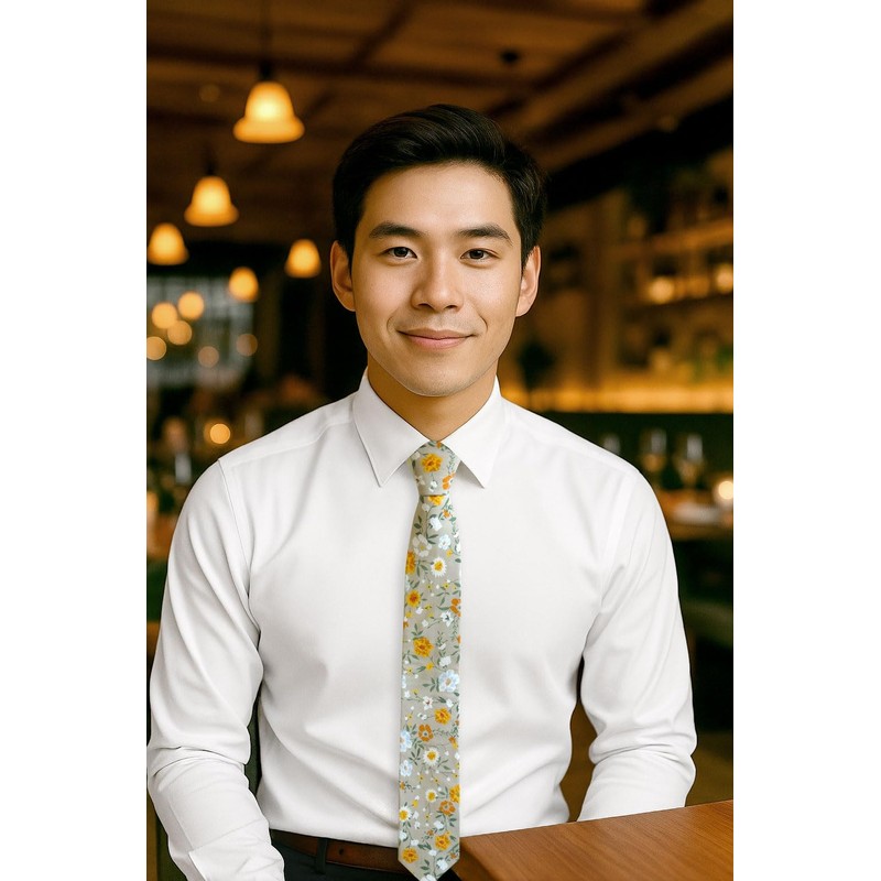 - High-quality, handcrafted men's skinny floral cotton necktie in a popular color with a modern floral pattern and minimal sheen, perfect for modern men's attire.