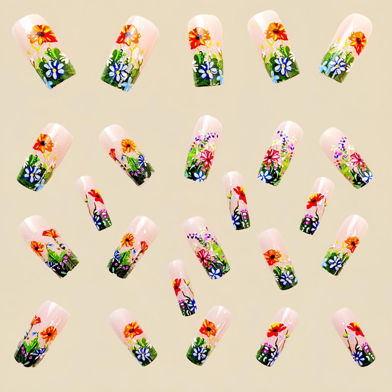 - Packaging: 24 flower long square fake nails in 12 different sizes, 24 jelly glue, a small wooden stick for removing nails, and a polished nail file.