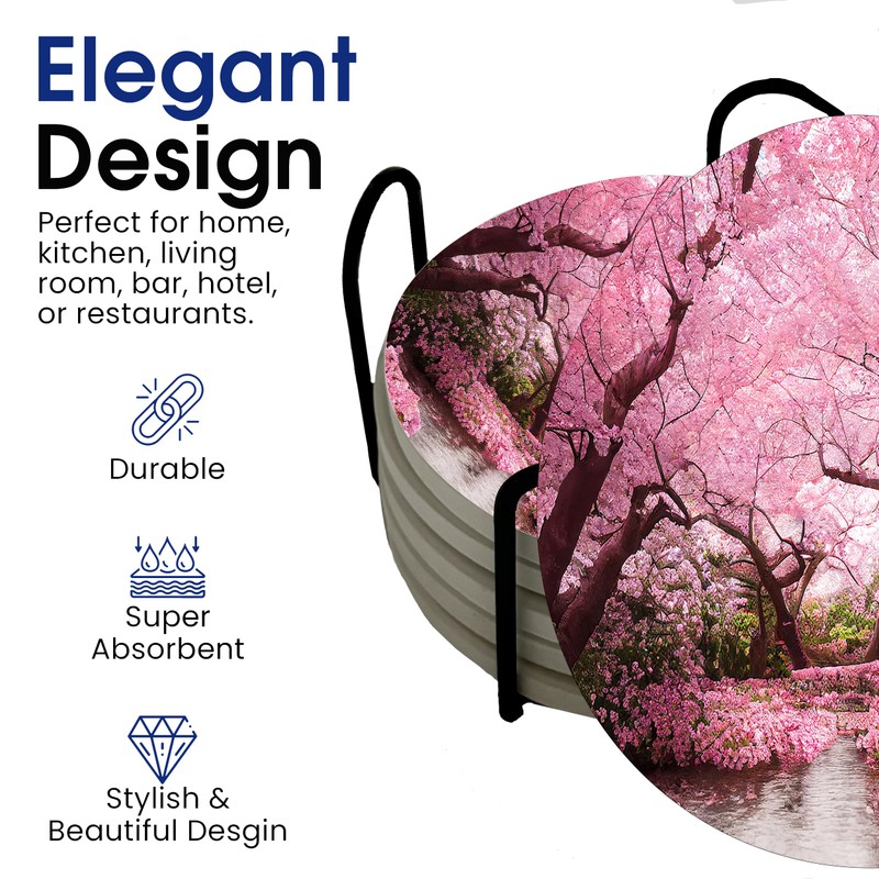 Spring Season Flowers Round Coasters Set of 6 - Abosrbent Ceramic Coasters with Metal Stand for Drinks, Coffee, Non-Slip Cork Back for Tabletop Protection, 4 Inches (Cherry Blossom)