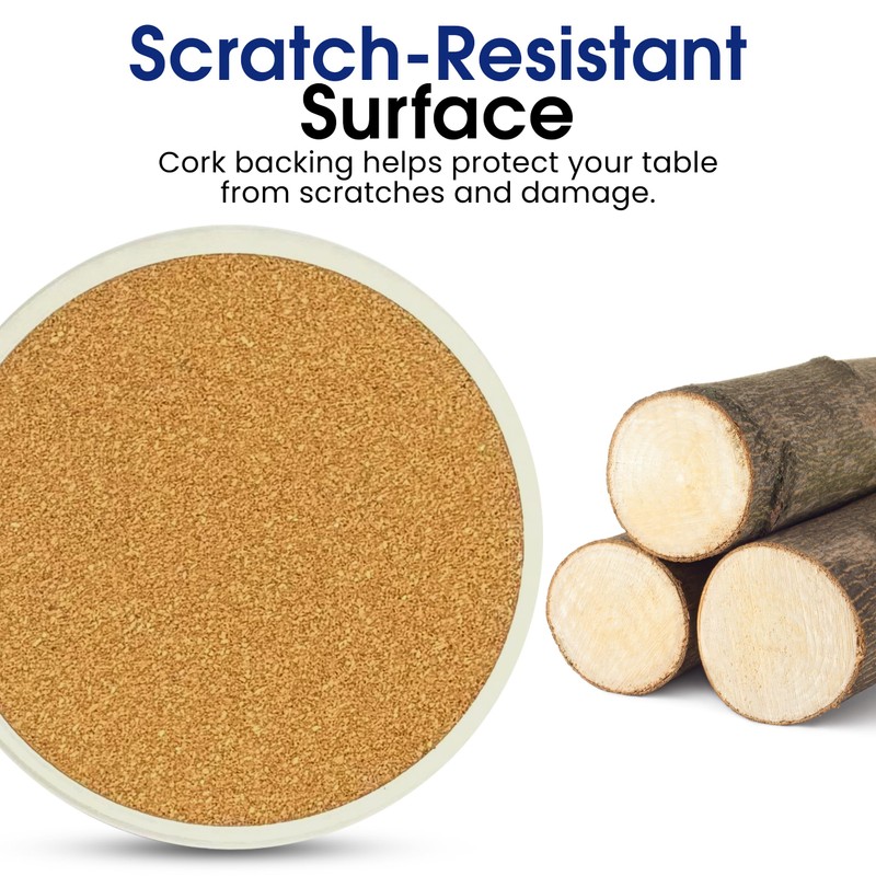 - Cork-Backed for Surface Protection – Each coaster in this coaster set features a cork backing that prevents sliding and safeguards your table from scratches, making them perfect for protecting delicate surfaces.