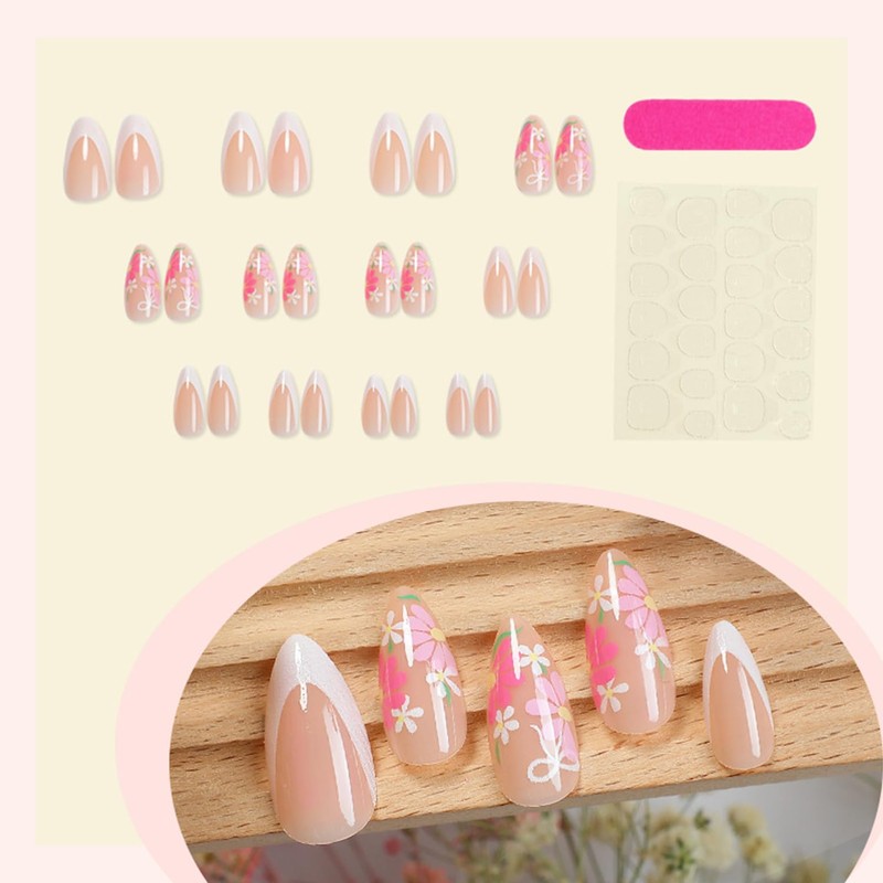 Spring Summer Flower Press on Nails with White French Tip False Nails Long Almond Glue on Nail Glossy Acrylic Artificial Nail for Women